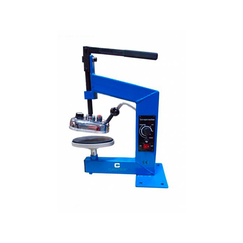 The device is equipped with an upper heater with a power of up to 500 W with adjustable temperature in the range of 120-195 ℃ and a bottom die with a rubber pad stabilizing the tire being repaired. The heater is embedded in the ball joint, while the lower die rotates by 360 °. This optimizes the work due to the easy and accurate adjustment of the term to the shape of the surface being repaired. In addition, the upper terma has a lever pressure. In the presented model of the vulcanizer, the control module is connected to the heater. The heating time is set by means of a knob (maximum 120 minutes), thanks to which continuous supervision of the device is not necessary. The warning lamp informs you whether the vulcanizer is switched on, which increases the operational safety.