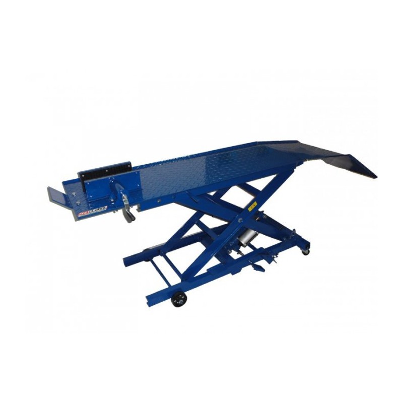 Intended for servicing motorcycles and quads, the width of which does not exceed 1300 mm with a lifting capacity of up to 500 kg, it has a handle stabilizing the front wheel and pneumatic drive.