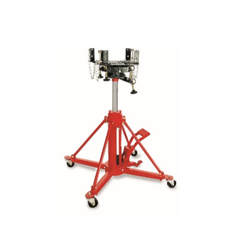 Lift, transmission base up to 1 Ton. Thanks to the two-stage lifting unit you can go down to min. 850mm height and raise the level 1800mm plus the height of the saddle, which can be useful and have universal application. It is ideal for light and medium-sized trucks and standard cars. The reinforced structure ensures stable operation when changing the gearbox as well as transport crates and even fuel tanks, etc.