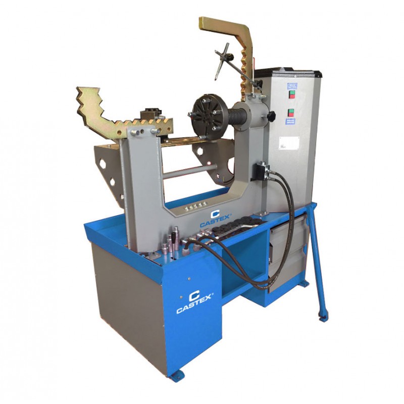 A straightening machine for CASTEX rims has been designed for professional removal of bends and rim damage that creates a problem during balancing. Damaged parts are defined as using a sensor, and the correction is done using an actuator with an appropriate overlay. The device is designed for repairs of steel and aluminum rims with diameters from 10 to 24 inches. The rim is repaired using a hydraulic cylinder equipped with a hydraulic cylinder appropriately selected shaped overlays that allow repair of the damaged rim at any point of its curvature. The device has a mounting disk with holes, which is used a properly selected centering ring ensures secure fixing of the repaired the rim regardless of the number of holes in the rim. This device is also perfect at work with blind rims, i.e. without a central hole. Strong and massive construction gives a sense of safety and comfort of work even in case of severe repairs.